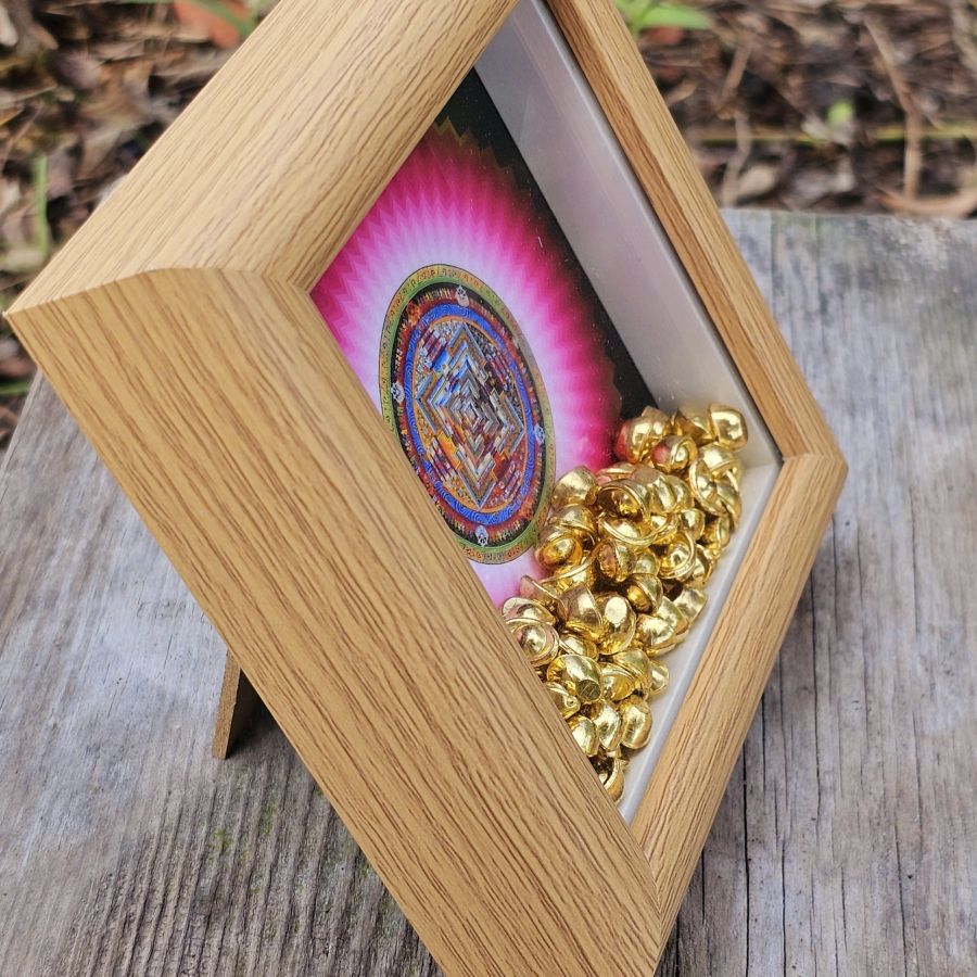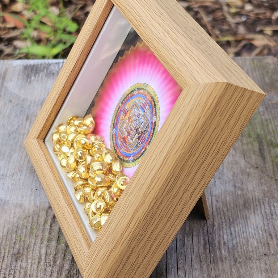Tranh mandala và thỏi vàng 🔸 Kích thước: 12 x 12 cm 🔸 Tranh: Mandala Kalachakra – Bánh xe Thời Luân Tây Tạng 🔸 Phối hợp: Thỏi vàng kim tượng trưng cho tài lộc sung túc